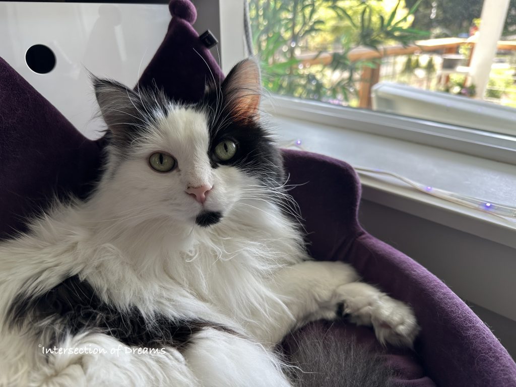 Did I mention his basket was a dark purple velvet throne? Because of COURSE he deserves it!