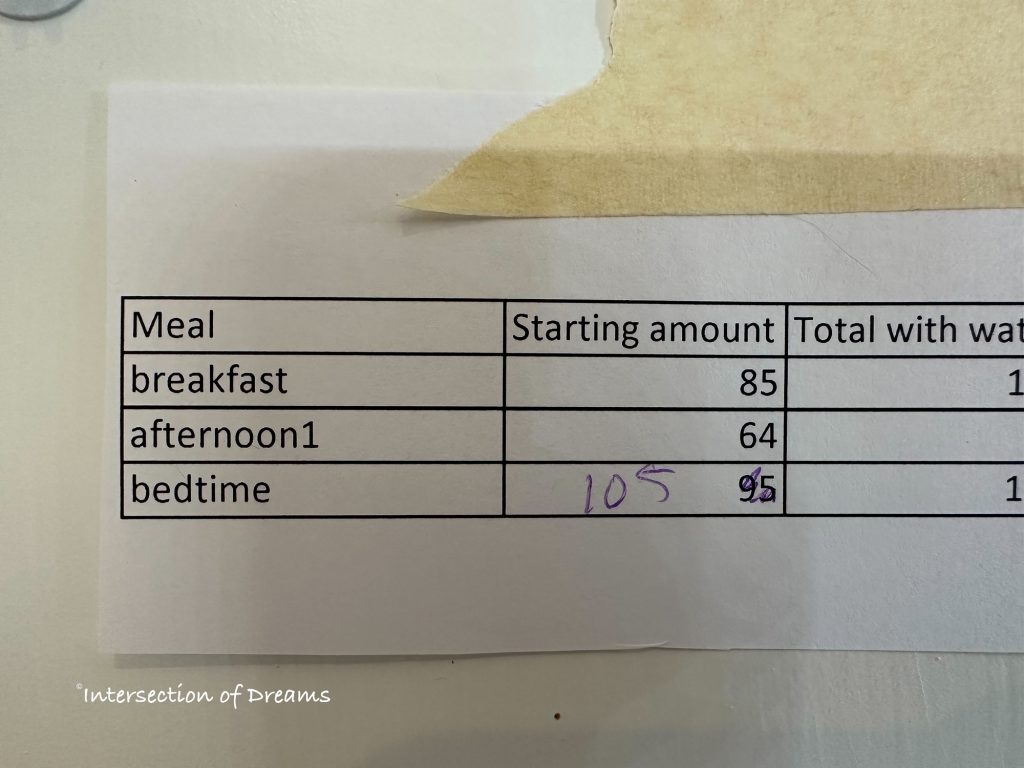 Pasted on the door inside the cabinet, just above the scale, is the meal chart with quantities for each meal: