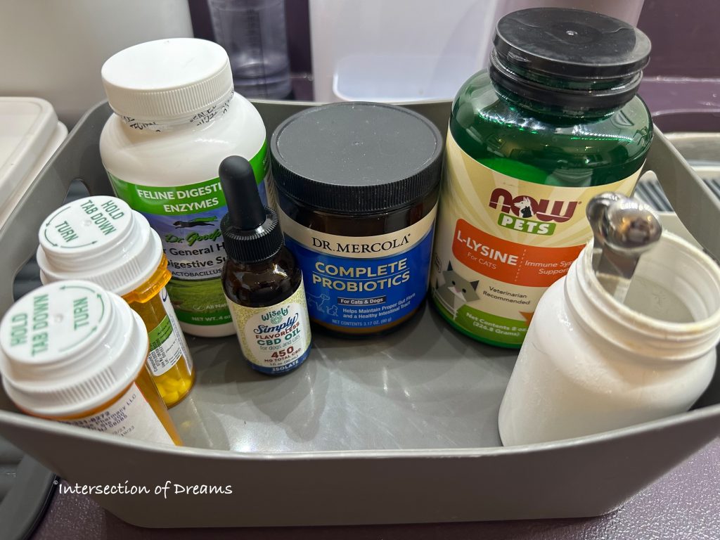 The supplements and medication basket has all my other tricks for keeping finicky, sensitive IBD kitties eating. Finn is on a once-daily steroid, Budesonide, to keep his IBD under control. Trixie is tapering off her daily dose of Gabapentin because it has been upsetting her system. A few drops of pet-safe CBD oil help keep Finn and Pixie’s anxiety managed, as well as soothes their stomachs. Everyone gets a scoop of digestive enzymes and probiotics mixed into their canned food to help boost their digestion, and Lysine powder is added if anyone has a feline herpes flare-up. The probiotics are especially helpful because they not only aid in digestion, they also apparently smell really, really yummy and that helps encourage everyone to eat. Trixie has a tendency to skip meals, which makes her nauseous, which makes her skip more meals, and too much of that leads to an IBD flare-up and another trip to the vet, so adding that yummy smelling probiotic has really helped improve her health. (Not pictured: Trixie’s asthma inhaler and AeroKat puffer, which she tolerates twice daily.)
