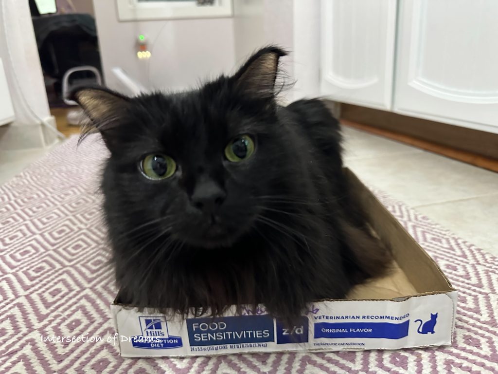Whenever I reload the kitty food cabinet, I always make sure to toss the food box on the floor for a while so the kitties can play with it. Pixie inspected it first today: