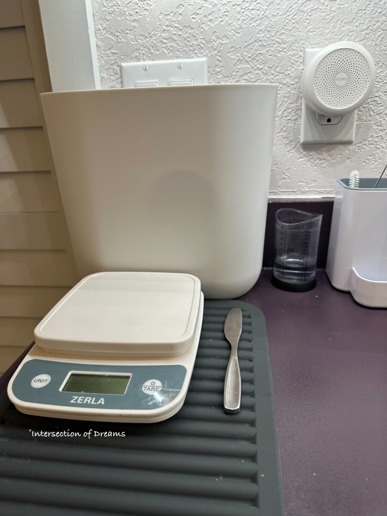On the counter below the cabinet I keep a small food scale, a cup of filtered, boiled water, and a small knife. Because everyone has challenges with food, it’s important to weigh their meals and make sure everyone is eating enough, but not too much. I mix a few spoonfuls of water with the canned food, which helps with hydration and also makes the rubber-like prescription food easier to eat. And the small dull knife pries up the pull tabs on the food cans so I can open them without hurting my hands.
