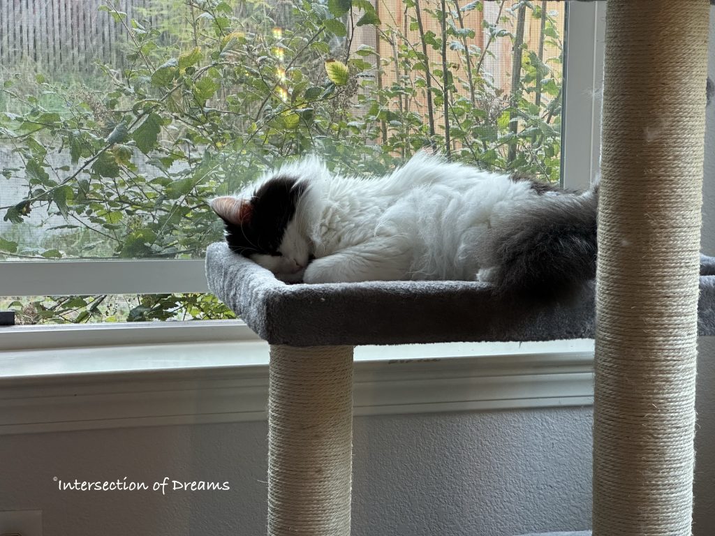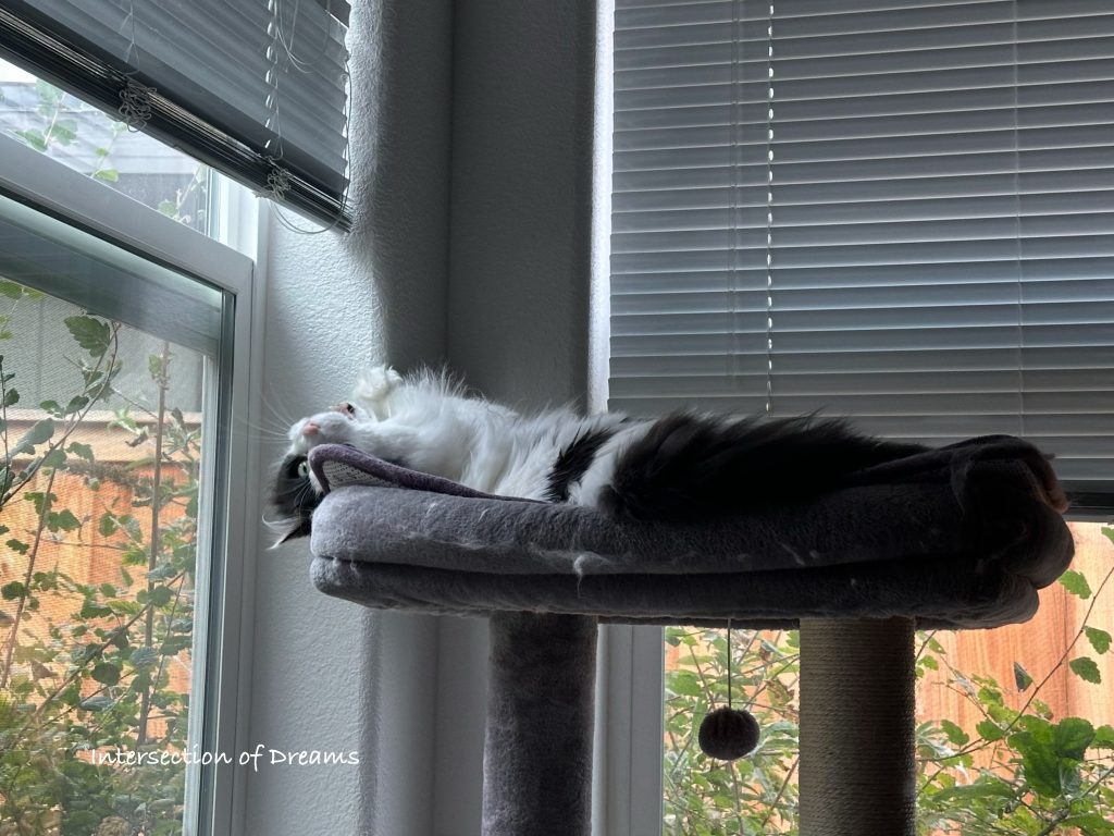 His favorite cat tower was a priority in the first day of moving, and by the second morning he was appreciating the view from the new windows:
