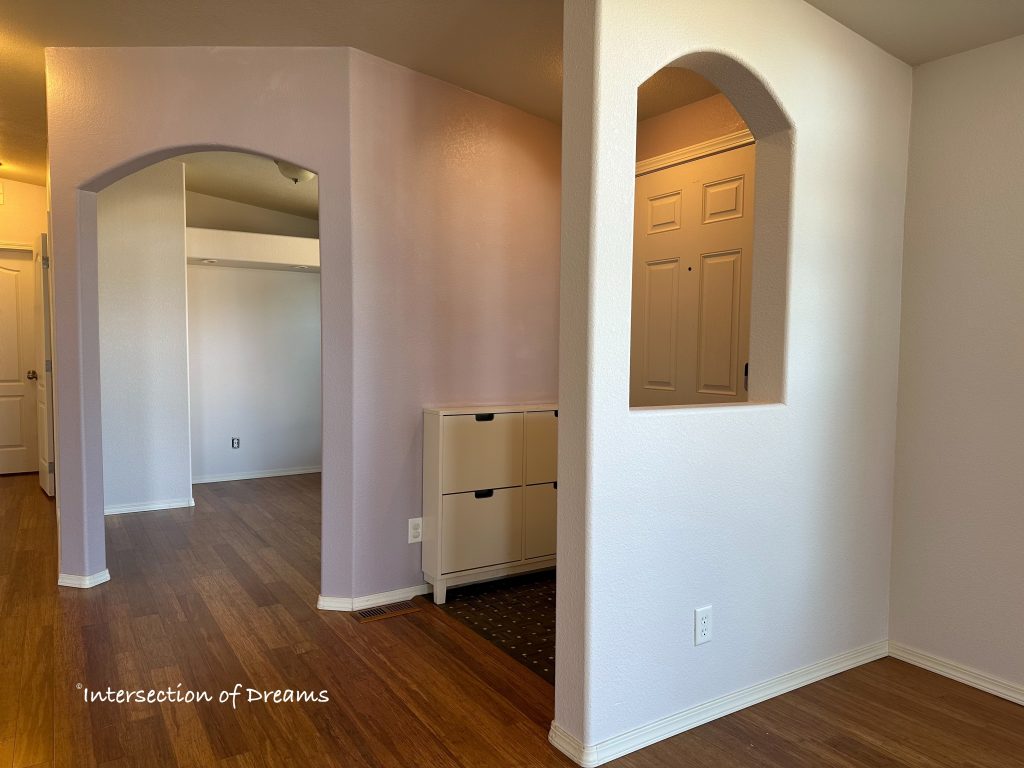 For extra fun, I did a second accent color in the small foyer and the “bonus room” that I will be using to expand the foyer and set up proper storage for outdoor gear, bags, and cameras. The challenge with this was finding the right lines for the transition from accent to regular wall color, and I definitely like how it turned out: