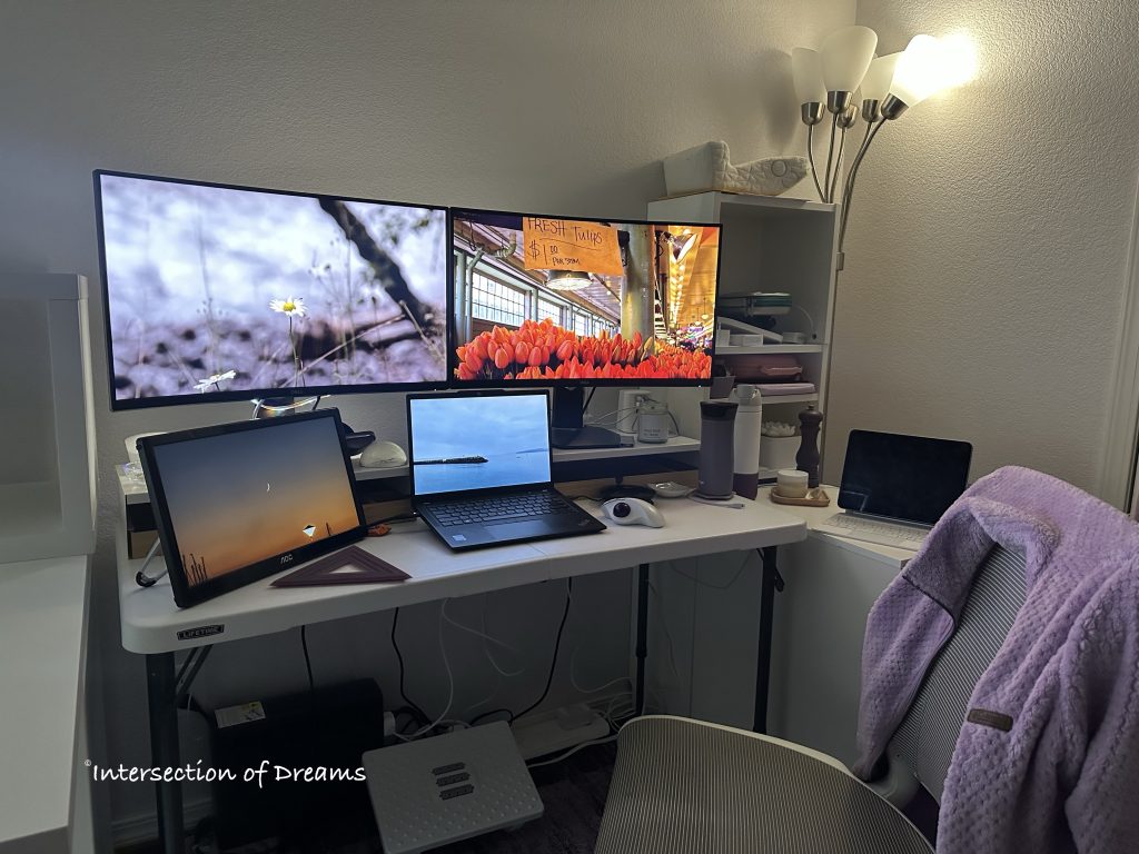 I’m probably exceeding the weight limit of the folding table, but my temporary desk setup in the new office is quite functional: