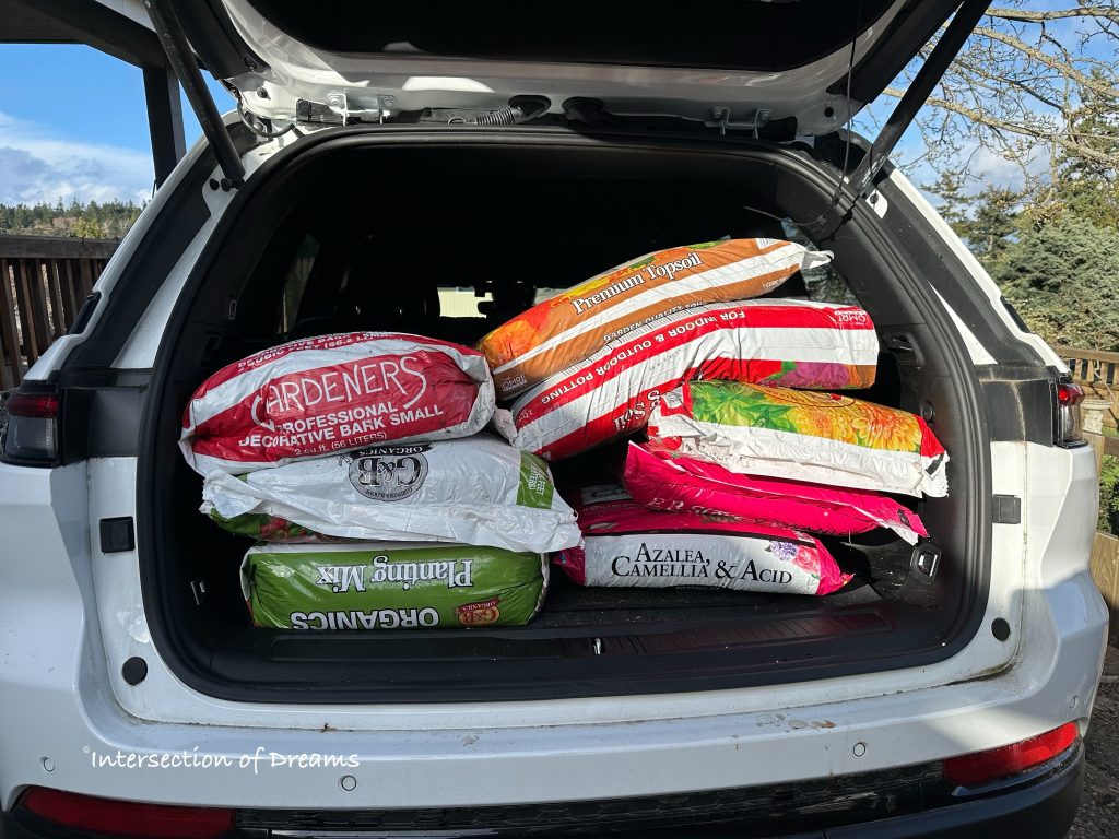 Then, since it was a nice day and I have way more plants to pot than I had soil left over, I made a quick trip to one of the local garden centers and loaded up!