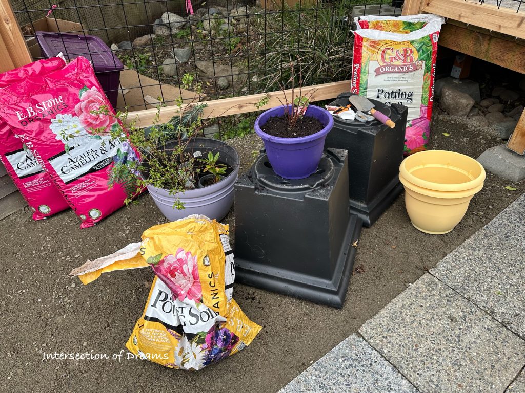 The weather has been pretty sketchy lately and I still need to assemble my potting table, but despite the wind chill and incoming storm, I was able to get a good start on repotting some hardy Fuchsias and Azaleas using a temporary setup.