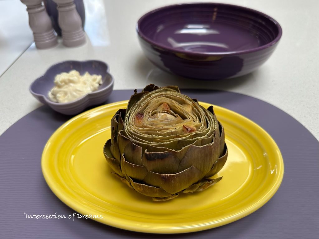 I’ve written this for one artichoke, as I often just toss one in the oven for an afternoon treat on a challenging work day. But it easily scales to multiple artichokes, just add 5-10 minutes cooking time per additional artichoke. And more garlic, of course!