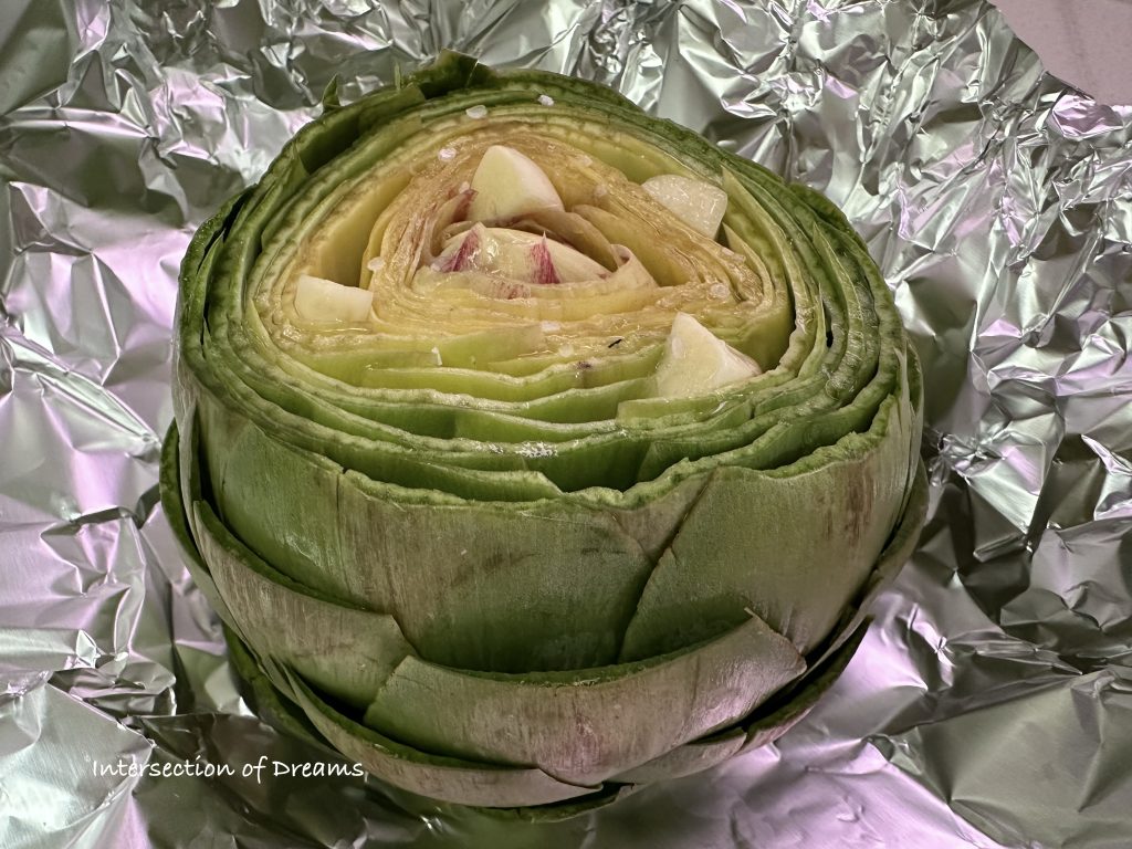 Here’s what your prepped artichoke will look like just before closing the foil. Notice the flat top on all the surrounding leaves, where the pointy top has been clipped off: