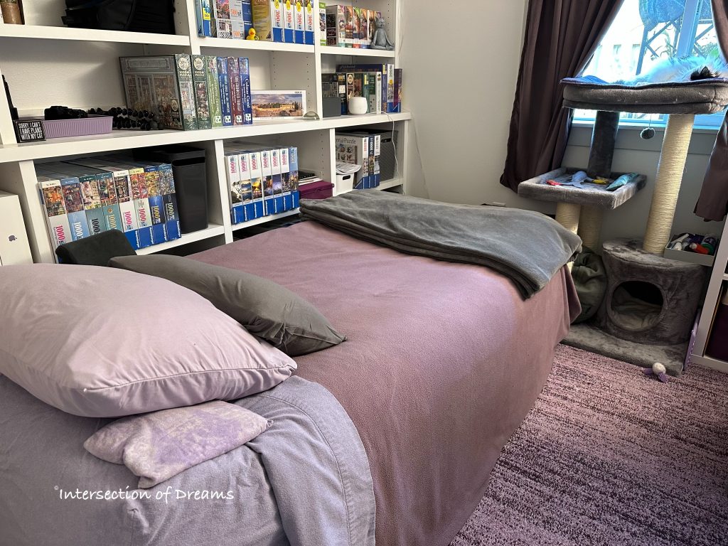 And then I realized. . . . .”I have Lands’ End flannel twin sheets at home!” So back to the linen closet for the fitted sheet which matches the top sheet I grabbed earlier. Took the cotton sheets off the air mattress entirely, tightened up the mattress pads, and put the flannel sheets on. The flannel top sheet is larger than the cotton sheet I’d been using so it has a nice decent overhang on both sides. Layered in the electric blanket and my small weighted half-blanket to keep me warm. Put the thin fleece blanket over the top of it all, folded the dark gray blanket (previously folded in half over the top of everything) across the foot section to weight my feet down, then put the Ikea bedspread in the donation pile because while I like the idea of a large purple bedspread, I strongly dislike the reality of the rough scratchy texture so I never use it.